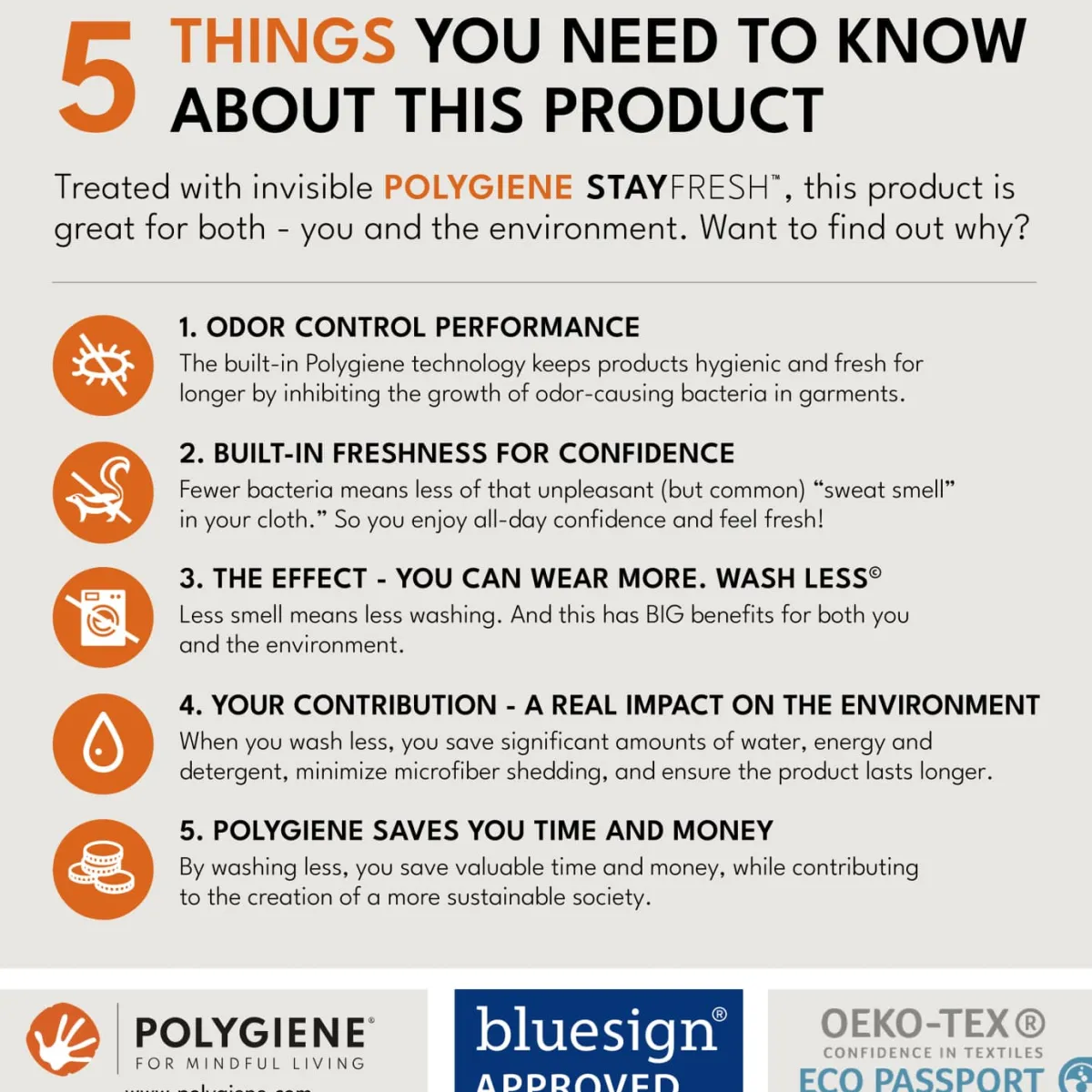 Polygiene StayFresh™ utrzymuje świeżość tego produktu dłużej i zmniejsza potrzebę częstego prania. W jaki sposób? Wbudowana technologia Freshness™ na bazie soli srebra działa 24 godziny na dobę, 7 dni w tygodniu, aby zapobiec rozwojowi bakterii powodujących nieprzyjemny zapach w ubraniach, dzięki czemu będziesz czuć się jak najlepiej bez względu na to, co robisz. Mniej nieprzyjemnych zapachów oznacza również mniej prania, oszczędność wody, energii i czasu. Mniej prania oznacza również dłuższą żywotność produktu, ponieważ około 50% zużycia pochodzi z prania.